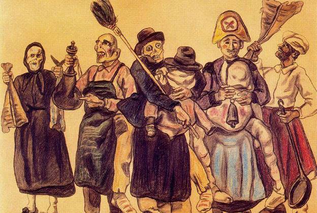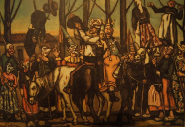Gutiérrez Solana, que compaginó la pintura con la escritura –y que fue “tan gran pintor como escritor”, según Camilo José Cela– tuvo pues en las máscaras y el Carnaval una de sus fijaciones temáticas, junto con los entierros, las procesiones, los lupanares o las “tabernas del morapio y los pajaritos fritos”. Por sus páginas y sus lienzos transitan mascarones, chulos, criadas, mendigos, prostitutas, traperos y, en general, toda la “golfemia” de su tiempo, que él captó con su personal expresionismo, a caballo entre lo trágico y lo grotesco.