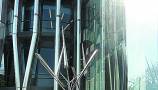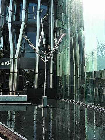 También en AZCA, en Torre Europa –sometida a una rehabilitación, en este caso más radical o más visible–, se ha instalado una interesante escultura móvil, como un árbol metálico con ramas en movimiento, que surge de una lámina de agua bajo la nueva monumental visera de cristal; su valoración, su comprensión requeriría más bien alguna pausa y reflexión. Es obra del escultor americano George Rickey, que, después de practicar la pintura, el diseño y la docencia, se especializó en escultura cinética, logrando una inequívoca identidad en sus construcciones geométricas y movimientos mecánicos; soluciones distintas a las de su coetáneo Calder. Poco conocido en España, pero sí en el resto de Europa, vivió algunos años en Berlín y su influencia llegó hasta motivar el Proyecto Escultural de Münster.