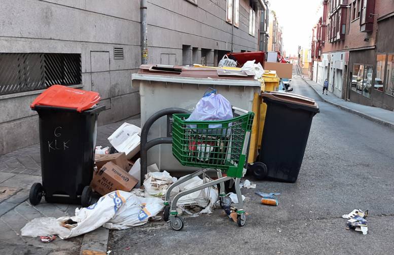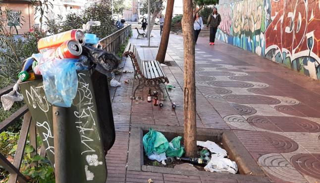 Son las 10 de la mañana de un lunes, y la calle de Nuestra Señora del Carmen vive uno de sus escasos momentos de paz. Apenas unas vecinas recorren el tramo entre la Plaza del Canal de Isabel II y el polideportivo Playa Victoria, y en el trayecto se cruzan con papeleras a rebosar, botellas de vidrio y decenas de botes de cerveza, que salpican el suelo, los bancos y todos los alcorques. Muy cerca, en la esquina con Los Molinos, una hilera de contenedores con bolsas de basura ya desparramadas por la acera y que en unas horas comenzarán a desprender malos olores.