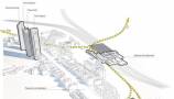 Unos bocetos donde se observa la distribución del complejo en tres edificios unidos por un jardín central de estancia pública, que esponjará la trama de esta zona del barrio de Almenara. El diseño se ha presentado como “un lugar para la cultura ferroviaria metropolitana”.
