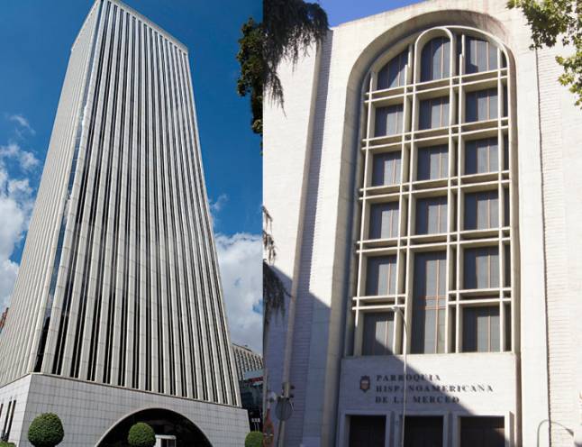 Por su parte, la Basílica Hispanoamericana de Nuestra Señora de la Merced (calle de Edgar Neville, 23) representó un ejemplo de la nueva arquitectura religiosa en España. Un cubo exento de imponentes dimensiones, con una cúpula de más de 20 metros de altura, finalizada en 1965. Su autor, Francisco Javier Sáenz de Oiza, fue también el responsable de la Torre BBVA, actual Castellana 81, situada en Azca y que desde 2019 ostenta la catalogación de Bien de Interés Cultural.