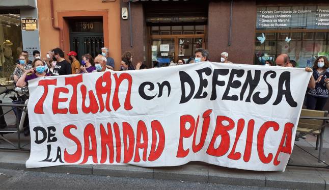 Al grito de ¡Los centros de salud no se cierran!, acompasado por las palmas de los presentes, más de 100 vecinos se concentraron detrás de una pancarta en la que se podía leer: “Tetuán en defensa de la Sanidad Pública”. Durante media hora expresaron sus protestas, centradas fundamentalmente en la presidenta de la Comunidad de Madrid en funciones, con proclamas como “Ayuso, esto es un abuso” o “Ayuso dimisión”, mezcladas con otras del tipo “Basta ya de recortar en Sanidad” y “Sanidad Publica”.
