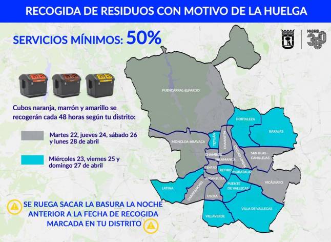 Para la recogida de residuos domiciliarios, cubo de restos (tapa naranja), orgánica (tapa marrón) y plástico-metal-brik (tapa amarilla), los servicios mínimos se han fijado en un 50 %. Deberán recogerse cada 48 horas como máximo y se ha establecido un calendario de recogida de los residuos domiciliarios, repartido en días alternos según los distritos. En Tetuán, se recogerán el miércoles 23 de abril, el viernes 25 y el domingo 27.