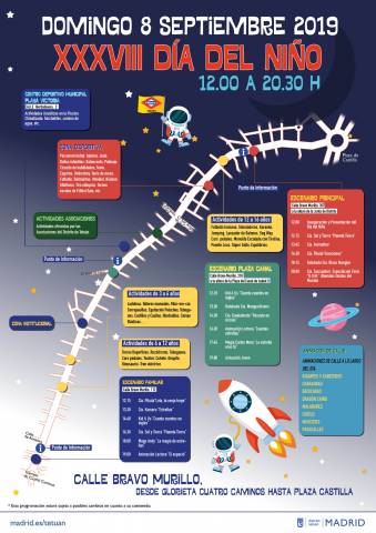 Esta vez se ha hecho esperar, pero ya está aquí: el domingo 8 de septiembre, el tramo de Bravo Murillo entre Cuatro Caminos y Plaza de Castilla volverá a ser invadido por miles de niños y niñas para celebrar su jornada más especial: el Día del Niño. Una celebración que este 2019 cumple 38 años, y lo hace rindiendo homenaje al medio siglo de la conquista del espacio. “Pequeños exploradores: de Madrid al cielo y de Tetuán a la Luna” es el lema de esta edición, que arrancará a las 12 del mediodía y desplegará, como cada año, decenas de atracciones, actividades y representaciones lúdicas por los tres kilómetros de la principal arteria del distrito.