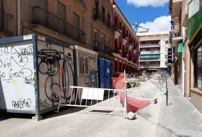 En esas llegó la pandemia y el confinamiento, la obra se paró, se volvió a reanudar a las pocas semanas… y así hasta hoy, cuando aún perduran materiales, vallas y casetas impidiendo el paso de vehículos y dificultando en extremo el de los peatones por sus aceras de apenas un metro de ancho.