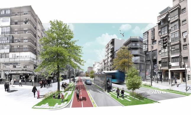 El proyecto aboga por un nuevo reparto del espacio público que aumente la anchura de ambas aceras, mejorando la seguridad y comodidad en los cruces, y que permita la aparición de usos estanciales y no sólo de tránsito en la calle, de modo que sea posible la plantación de más árboles y la colocación de más bancos.