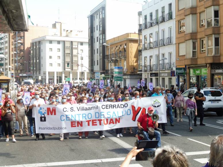 La manifestación comenzó junto al Centro de Especialidades José Marvá, en Bravo Murillo, 317, con dos carriles de la circulación cortados al tráfico en sentido Cuatro Caminos. A la cabeza, una pancarta con el lema “Centro de Salud Villaamil cerrado. Centro de Salud en Tetuán ya”, con el hashtag #sanidadpublica. La marcha, integrada inicialmente por poco más de un centenar de personas, fue avanzando por Bravo Murillo, entre aplausos y proclamas: “Queremos en el barrio un centro de salud”, “Menos chiringuitos, más centros de salud”, “Ayuso dimisión”, “Miles de vecinos al quinto pino” o “Queremos la mano que tiene Nacho Cano” (en alusión a la cesión que ha hecho el Ayuntamiento al cantante en una parcela del barrio de Hortaleza, para construir una pirámide de 30 metros de altura en la que organizar espectáculos musicales).