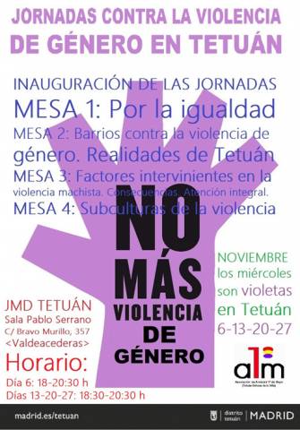 El 25 de noviembre se celebrará el Día Internacional contra la Violencia de Género, y en Tetuán se va a conmemorar con diferentes actos, de entre los cuales el central serán las Jornadas que se celebrarán todos los miércoles y que ha organizado la Asociación de Amistad 1º de Mayo Tetuán-Dehesa de la Villa.