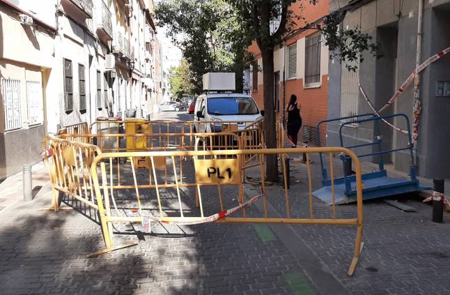 Los vecinos de la calle de Oviedo llevan ya demasiados meses viviendo una situación tan insólita como molesta. Un día del pasado abril se despertaron con la calle cortada al tráfico por hasta ocho vallas, situadas hacia la mitad de la vía, mientras un precinto de los bomberos cruzaba uno de los portales junto al vallado, y una rampa facilitaba la entrada en el de al lado. La calle no presentaba ningún desperfecto aparente y no había más avisos ni señalizaciones.