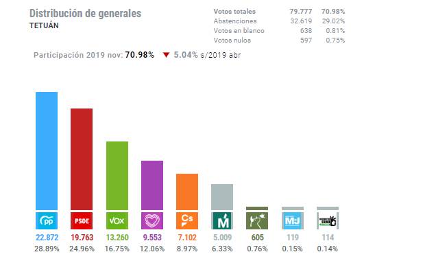 El candidato socialista Pedro Sánchez ha sido el vencedor de las elecciones del pasado 10 de noviembre, con 120 diputados y el 28% de las papeletas. Sin embargo, en Tetuán ha sido el PP la formación más votada, una circunstancia que se había repetido en las últimas tres décadas hasta las anteriores elecciones del 28 de abril, cuando fueron superados por el PSOE.