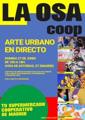 Este domingo 27 de junio, seis artistas urbanos plasmarán en los exteriores del supermercado cooperativo LA OSA de Madrid (Avenida de Asturias, 57) sus bocetos nacidos alrededor de la temática: “Una alimentación más justa y sostenible es posible gracias a la cooperación”.