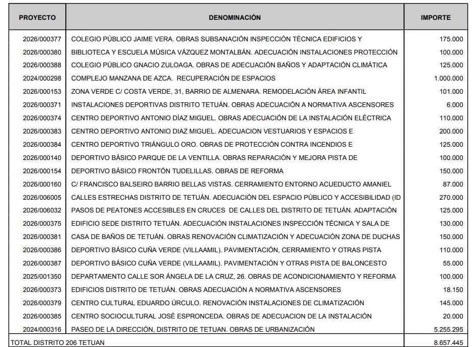 No obstante, esos 8,6 millones representan más del doble de la inversión municipal en Tetuán llevada a cabo en 2025, cuando fue de 4.198.212 euros. También el número de proyectos se ha duplicado: de los 10 de este ejercicio a los 23 previstos en nuestros barrios para 2026.