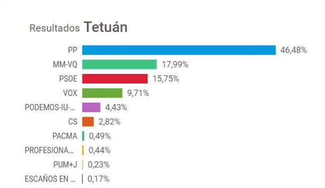 En el distrito de Tetuán, el reelegido alcalde de la capital obtuvo un 46,5% de los sufragios, muy lejos del resto de candidaturas: Más Madrid logró un 18 %, el PSOE, un 15,7 % y Vox, un 9,7 %. Podemos, por su parte, sumó en el distrito un 4,4%, mientras Ciudadanos se quedó en el 2,8%.