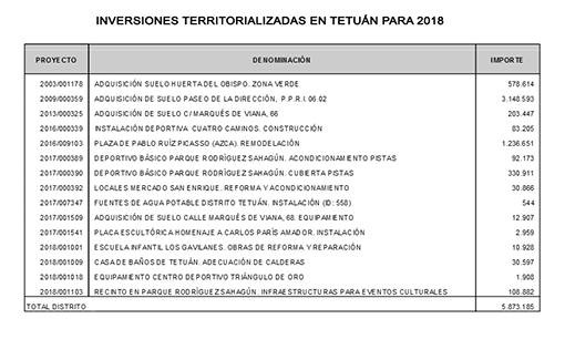 El Ayuntamiento de Madrid destinará este año a Tetuán un Presupuesto de 25.678.885 euros, lo que significa un descenso de 2.447.340 euros (-8,7%) respecto al de 2017. Las cuentas municipales incorporan además una quincena de inversiones territorializadas, por un importe de 5.873.185 euros, entre las que destacan varias adquisiciones de suelo en el paseo de la Dirección o la remodelación de la Plaza de Pablo Ruiz Picasso, en AZCA.
