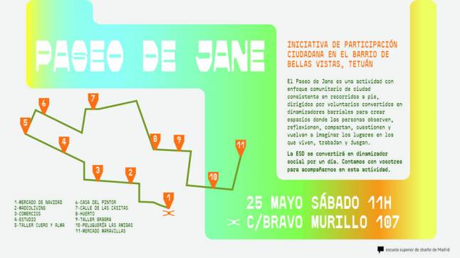 La Escuela Superior de Diseño de Madrid ha organizado un “Paseo de Jane por Bellas Vistas” para que vecinos y curiosos puedan descubrir los secretos y reflexionar sobre el urbanismo de este barrio tetuanero. La cita es el sábado 25 de mayo, a partir de las 11 de la mañana.