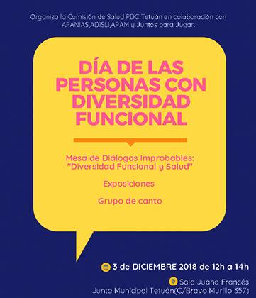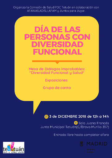 El próximo 3 de diciembre la Comisión de Salud del Proceso de Desarrollo Comunitario de Tetuán organiza el Día de las Personas con Diversidad Funcional, una jornada en la que se llevarán a cabo diversas actividades, con el objetivo de dar a conocer y sensibilizar a los vecinos sobre el Día Internacional de la Diversidad Funcional.