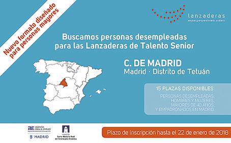 La primera de estas “Lanzaderas de Talento Senior” arrancará este mismo mes en el distrito, y finalizará en abril –posteriormente, en mayo, se iniciará una segunda–. Contará con 15 plazas destinadas a hombres y mujeres mayores de 40 años, que se encuentren en situación de desempleo y empadronados en la ciudad de Madrid.