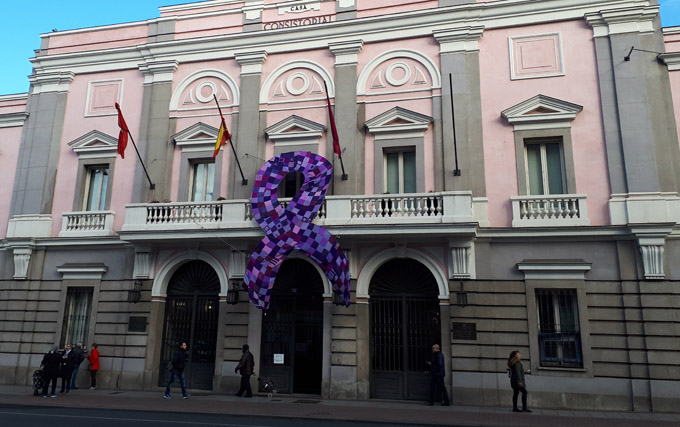 Junto al programa preparado por la Junta, Tetuán albergará otras iniciativas organizadas por diversos colectivos del barrio para conmemorar el 8M. Así, desde el Proceso de Desarrollo Comunitario se ha elaborado un lazo tejido por vecinas voluntarias. La confección, llevada a cabo en el Huerto Urbano de La Ventilla, luce desde el miércoles 6 de marzo en el balcón de la Junta Municipal.