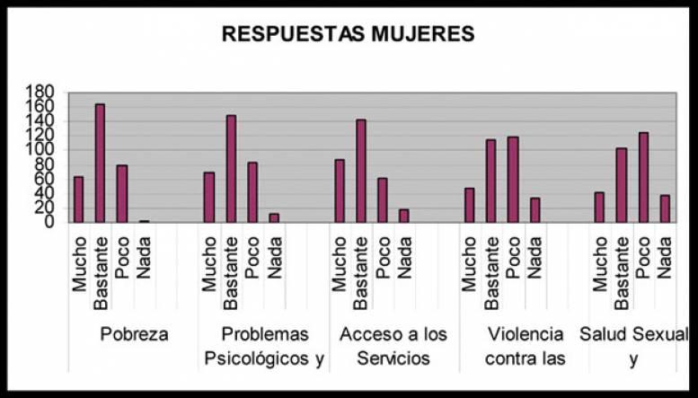 Este grupo de trabajo, del que forman parte miembros de distintas instituciones de salud, sociales y comunitarias del distrito (médicos, psicólogos, enfermeros, trabajadores sociales…), acordó que, según su experiencia, las cinco áreas más importantes sobre las que debían preguntar eran: pobreza, violencia de género, salud mental (problemas psicológicos y emocionales), salud sexual y reproductiva, y acceso a los servicios sanitarios.