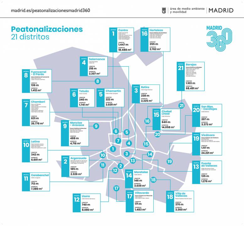 El plan afectará a 48 tramos de los 21 distritos, aunque el reparto de la superficie será desigual. Así, mientras Barajas (68.491 m2), Chamberí (26.766 m2) o Vicálvaro (24.221 m2) serán las zonas donde más espacio se ganará para el peatón, Tetuán, con 1.741 metros cuadrados peatonalizados –un 0,8% del total–, será el cuarto que menos espacio gane, sólo por delante de Villaverde, Fuencarral-El Pardo y Puente de Vallecas.