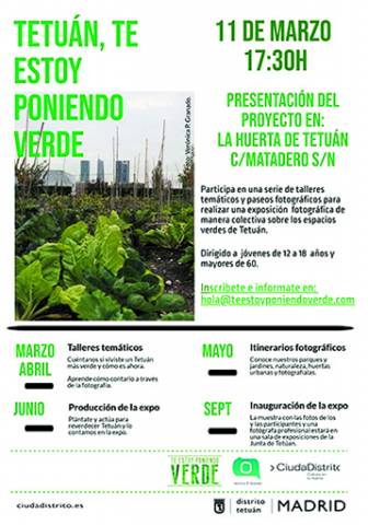 “Te estoy poniendo verde”. Proyecto colectivo con talleres y paseos fotográficos, sobre los espacios verdes en Tetuán. Dirigido a jóvenes, entre 12 y 18 años, y a mayores de 60. Actividad gratuita. Inscríbete en el correo: