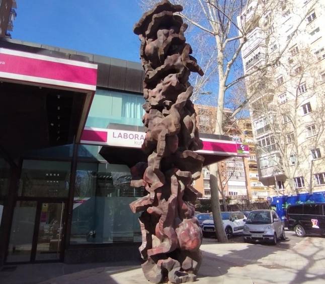 La escultura que hoy os presentamos se llama ‘Broca’ y su autor es Vicente Larrea Gayarre, un conocido escultor bilbaíno, que murió en marzo de 2024, hace apenas un año. La obra está situada en el paseo de la Castellana, 167, esquina con la calle de Rosario Pino, junto a la entrada de la sucursal bancaria Caja Laboral.