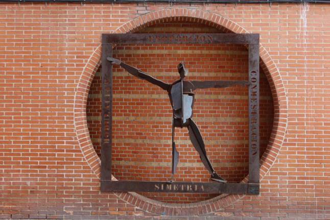 En el lado opuesto a Bravo Murillo, entrando desde la calle de Müller por el Pasaje de Maestros Ladrilleros, nos encontramos en la pared del edificio, en el lateral izquierdo, una representación escultórica del hombre de Vitruvio, obra del escultor palmense Juan Enrique Bordes Caballero (1948). La escultura, realizada en acero cortén, se titula ‘Hombres y proporciones’ (1995), y hace referencia a la proporción humana como medida de la arquitectura. Fue financiada por la Asociación Española de Fabricantes de Ladrillos y Tejas, y diseñada para que formara parte de uno de los edificios más singulares de la plaza, obra del arquitecto Josep María Adell.