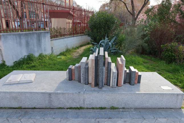 “Palabras pétreas” es una intervención escultórica de 640 x 215 x 140 cm, sobre plataforma irregular, que consta de 25 bloques de piedra con texto al chorro de arena que simulan libros de diferentes tamaños, y en cuyo lomo se inscriben en relieve los títulos más representativos del autor. Al otro lado de la plataforma, un libro abierto, también en piedra, contiene en su mitad derecha un relieve con el rostro del poeta y, al otro lado, el nombre con el que firmaba sus obras: Leopoldo de Luis.