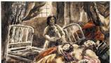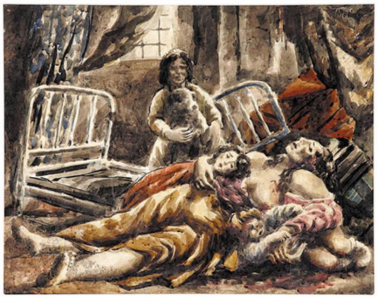Y es precisamente esa circunstancia la que ahora le ha dado una efectiva notoriedad, pues Jesús Molina fue uno de los artistas seleccionados para el Pabellón de la República Española en la Exposición Internacional de París de 1937, acompañando al Guernica de Picasso. Y ahora vuelve a estar presente, con una de aquellas acuarelas presentadas, nada menos que en el Museo Reina Sofía, en una sala contigua al mítico cuadro. Se trata de una de las seis obras perdidas, como otras muchas del Pabellón y, en este caso, encontradas y recuperadas muchos años después en los almacenes del Museo Nacional de Arte de Cataluña en Montjuic; y entre ellas se encuentra la titulada “Madrid, Tetuán de las Victorias” (sobre papel 65 x 50). Refleja una imagen angustiosa y patética de las muchas que causaron los bombardeos que se ensañaron con la población civil, concretamente en Tetuán, en enero de 1937; ahora se encuentra en los fondos del museo madrileño, gracias al generoso depósito de la familia del pintor.