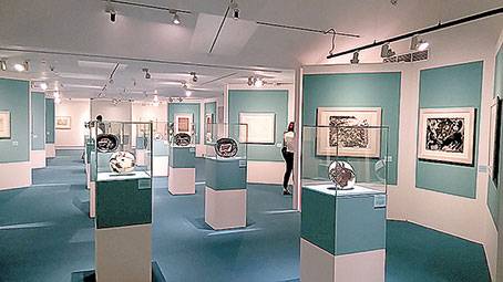 Los grabados y las cerámicas que conforman la exposición muestran dos de las señas de identidad de Picasso, como son el desarrollo de un lenguaje artístico completamente personal y el peso de la cultura mediterránea. Además, el montaje expositivo transporta al visitante a orillas del Mediterráneo, evocando playas y rincones junto al mar, a través de la alternancia del azul turquesa y el blanco.