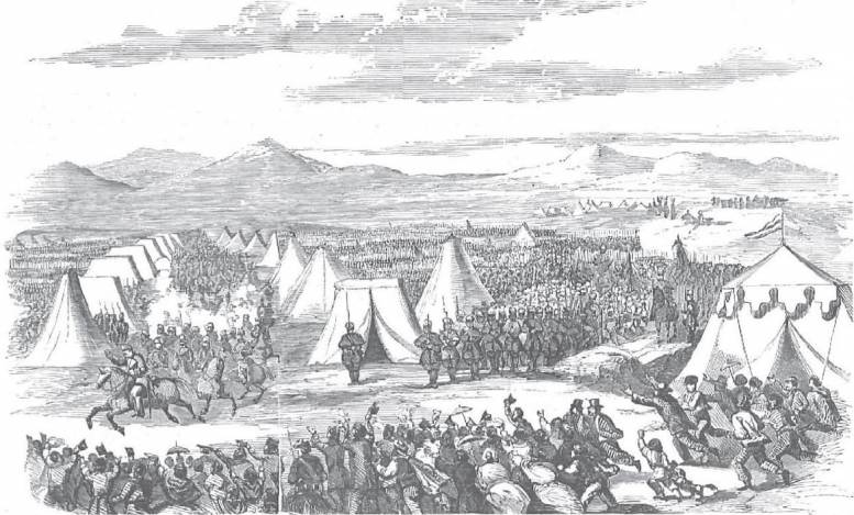 Los días previos habían ido llegando las tropas, y el 10 de mayo quedó dispuesto un campamento semejante al de campaña. Una ciudad ambulante “levantada en breves minutos”, gracias al “ingenio de la guerra”, señalaba la prensa. Recién llegado a Atocha, el victorioso general Leopoldo O’Donnell, Duque de Tetuán, se dirigió a caballo hasta la acampada, donde contaba con tienda propia, regalada por el Ayuntamiento. Por la tarde, ministros y personalidades distinguidas de la sociedad madrileña se unieron al pueblo llano y acudieron en masa a visitar el emplazamiento.