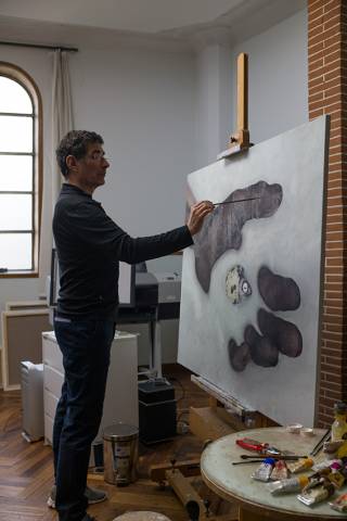 “Yo tenía ganas de vivir en Europa”, cuenta Jesús, “y me acordé de esta casa, que estaba desocupada y era de unos amigos. Fueron muy generosos. Nos dijeron: es la casa de un pintor, y vosotros lo sois, así que adelante”. Ellos mismos reformaron la vivienda, que cuenta con tres plantas, jardín y varias terrazas y está rematada por un espectacular y luminoso estudio en el último piso. Mantiene además parte del mobiliario y los enseres antiguos, incluyendo los caballetes de Santa María o una mesa que conserva fragmentos de metralla del obús que atravesó la cristalera durante la Guerra Civil. También un piano que, cuando el sol del atardecer entra por un ventanal y tensa las cuerdas, toca solo. “Estuvimos algún tiempo aterrados, hasta que nos lo explicó un amigo músico”, recuerdan.