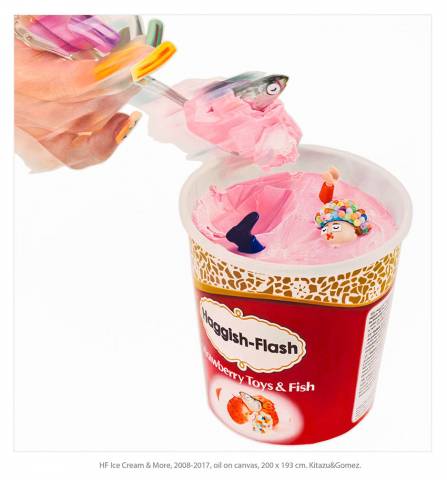 Así llegaron a Haggish flash, donde muñecos, pescados, fresas o partes de la anatomía de los artistas desfilan en un proyecto con tintes pop, “envasado” en tarrinas de helado recicladas de una marca ficticia, y que se concreta en una serie de pinturas muy próximas al hiperrealismo. Con ellas se adentran en un terreno intimista y de búsqueda del autoconocimiento, una propuesta que imbrica lo artístico y lo vital, pero que también aborda temas como la multiculturalidad, la ambigüedad sexual, los roles establecidos, la empatía o la exclusión. “Usamos un lenguaje publicitario para transmitir nuestras ideas, porque dentro de nuestras mínimas posibilidades queremos cambiar las cosas, darle una función al arte”.