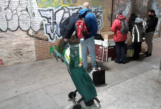 Poco a poco van llegando los voluntarios, cargados con mochilas, bolsas y hasta carros de la compra, llenos de alimentos comprados o hechos por ellos mismos en sus casas: Rober, Irene, Ana Cristina, David y Camilo, junto con Tetuán 30 días, iniciamos las visitas a estas personas necesitadas. La primera parada es en la misma puerta de El Corte Inglés, donde está Víctor con su perro pidiendo unas monedas. Hablan con él, se abrazan y le dan algo de comida, con un caldo de pollo. Después seguimos hasta encontrar a una familia de rumanos, cinco personas viviendo entre cartones, que comentan que “estamos pasando mucho frío. Necesitamos pantalones, zapatillas, calcetines”, les dicen a los voluntarios, que lo van apuntando. Se nota que agradecen la ayuda, lo reflejan sus ojos y los gestos cuando se abrazan. Incluso en sus caras nunca falta una sonrisa y hasta algo de humor: “También necesitamos billetes de 500 euros”.