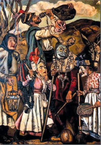 Pero la fiesta sigue. Más allá aparece un hombre vestido de oso, con una cadena atada a su amo. La estampa no transmite excesiva alegría. Las máscaras “hablan con voz natural y parece que no se han vestido para hacer reír y entretener a la gente, sino para cumplir un deber sagrado con el Carnaval”.