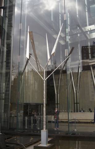Ya en la Torre Europa se alcanza otra de las últimas obras aterrizadas en el distrito, también de propiedad privada. Se trata de una escultura mecánica, como un árbol metálico con ramas en movimiento. Su autor, el escultor estadounidense George Rickey, fallecido en 2002, es uno de los exponentes más relevantes del arte cinético.