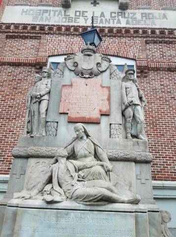 Por último, ya en el vértice del distrito, el Hospital de la Cruz Roja San José y Santa Adela (Reina Victoria, 22-24) dispone en su entrada de un conjunto dedicado a Carmen Angoloti, duquesa de la Victoria, y que homenajea también a las enfermeras de la Cruz Roja. En la obra, instalada en 1925 –la más antigua, por tanto, de las citadas en este reportaje–, la que fuera impulsora de la creación de escuelas de enfermeras en España atiende a un soldado herido, y el grupo se remata con las figuras de un oficial de regulares, uno del tercio de Marruecos, un soldado indígena y un legionario, con la que concluye esta inexplorada ruta escultórica por el distrito.