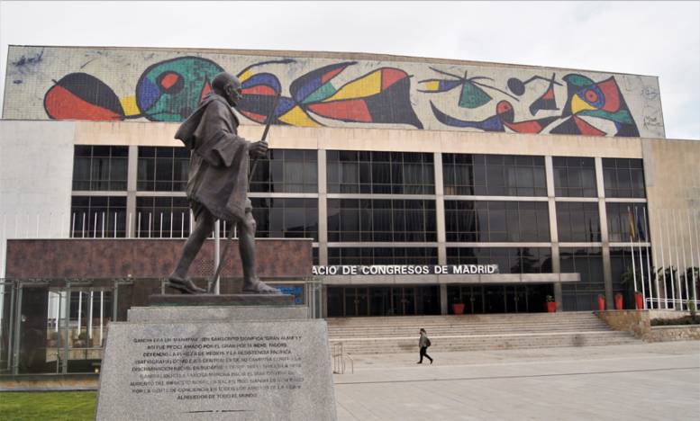 Enfrente, en la avenida del General Perón, se localiza el célebre mural del Palacio de Congresos, obra del pintor Joan Miró y del ceramista Joan Gardy Artigas y que consta de 7.000 placas cerámicas pintadas y vidriadas. Sin duda, uno de los espacios más reconocibles de esta parte del distrito. Desde 2013, la explanada del palacio está custodiada por una estatua de Gandhi, en bronce y de tamaño real, que conmemora la “marcha de la Sal” del líder indio. La pieza, un regalo del Gobierno indio a varios países europeos, pertenece al veterano artista Ram Vanji Sutar, autor de la estatua más alta del mundo (182 metros), localizada en India.