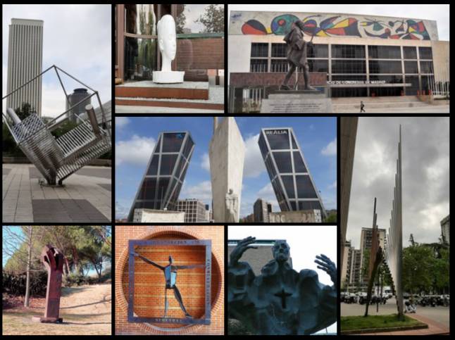 Ya en el barrio de Castillejos, y hasta la Plaza de Castilla, se reparten varias esculturas, comenzando por la del fundador de la Academia Brasileña de las Letras, Joaquim Mª Machado de Assis, en la avenida del Brasil, obra de Bartolomeu-Humberto Cozzo, o las dos abstractas que flanquean el Ministerio de Energía, Turismo y Agenda Digital (Poeta Joan Maragall, 41), una de ellas –la de la derecha, titulada ‘Equilibrio horizontal móvil’–, perteneciente al zamorano José Luis Alonso Coomonte; en el lateral del edificio se sitúa un notable mural de cerámica, elaborado según dibujo de Manuel Viola –perteneciente, como Juana Francés y Pablo Serrano, al grupo El Paso– y con relieves vidriados de Andrés Galdeano, finalmente, en la esquina opuesta de la manzana (Orense, 58), donde estuvo el Banco Exterior, se ubica otra escultura geométrica de acero, del escultor ‘Feliciano’ (Hernández Sánchez).