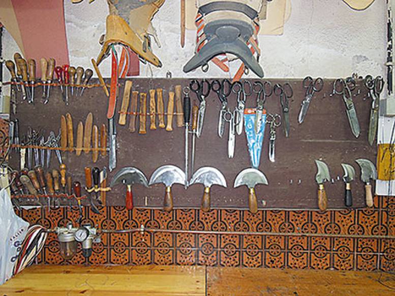 Es en ese momento cuando dejamos la tienda para adentrarnos en el maravilloso mundo de las herramientas, algunas antiquísimas, con nombres que emulan a otras épocas, y donde el intenso olor a cuero embriaga a quien no esté acostumbrado. Antonio recorre cada una de ellas con la mirada, las señala, las coge y las enseña con la misma ilusión y brillo en los ojos que un niño cuando enseña sus juguetes nuevos: “Éstos son desfloradores, para introducir el hilo en un surco y que no ocupe; cuchillos de compás para sacar correas, tijeras, martillos, uñas, cuchillos de media luna, regladores para hacer líneas en el cuero para el adorno, punzones, desclavadores, compases para marcar las costuras, matulejos de un solo pelo y de dos, matacantos o recanteadores, sacabocados, pasacintas que tendrán más de 100 años, mazos, leznas…”. En este paseo visual, llegamos al panel de las tijeras y me llama la atención la gran variedad. “¿Para qué tanta tijera?”, exclamo, arrancando sendas carcajadas: “Por los diferentes materiales: éstas para el cuero grueso, para lonas y pieles finas, o para telas, hilos…”. Cada una de estas herramientas podría decirse que son auténticas joyas, dignas de museo, que, gracias al buen uso y cuidado, “manteniéndolas siempre afiladas con piedra de aceite mineral o de agua”, han sobrevivido hasta hoy. Pero no sólo las herramientas, también las máquinas.