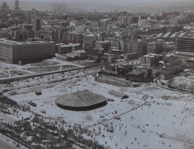 El recorrido también hace parada en lo que décadas después sería la manzana de AZCA y que, entonces, era un inmenso solar con una carpa circense y alguna que otra edificación frente a los Nuevos Ministerios, estos ya sí construidos. También una avenida de Raimundo Fernández Villaverde casi indistinguible, salvo por el ya desaparecido Taller de Precisión de Artillería y con, al fondo, la antigua Colonia Maudes de hotelitos alineados, donde se ubicó el Colegio Athenea.