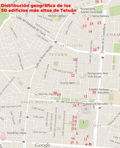 Con todo, la distribución de los edificios altos en el distrito es desigual, con barrios como Valdeacederas, Berruguete y Bellas Vistas sin presencia de éstos. De hecho, en el lado occidental de Tetuán solamente la Puerta de Europa I y el edificio Plaza Castilla 3, ambos en Almenara, figuran en la nómina. El grueso de los rascacielos se lo lleva la parte oriental, con un total de siete en Castillejos –Meliá Castilla, Eurobuilding 2, Torre Rioja, Cuzco III y IV, Castellana 181 y Capitán Haya 49– y el resto en Cuatro Caminos, 14 de ellos en el ya citado AZCA.