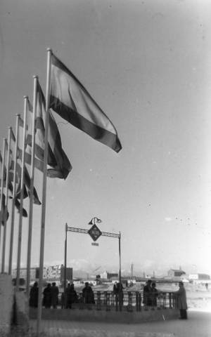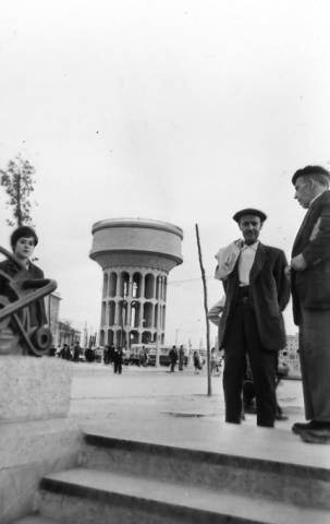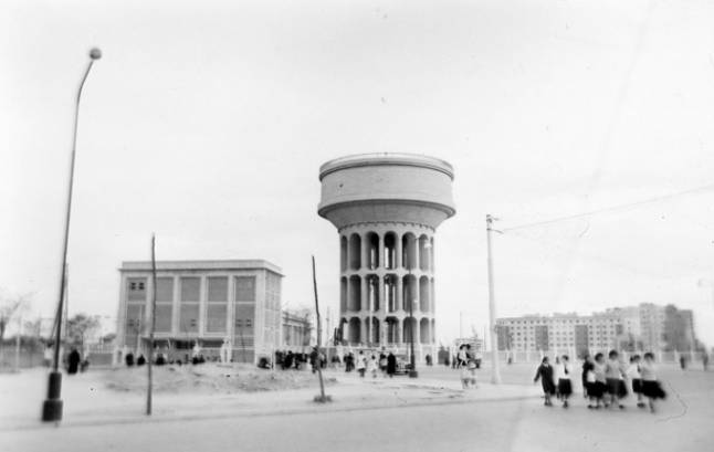 Allí estaban ya las banderas preparadas para el acto en un horizonte pelado de construcciones, con el inevitable revoloteo de curiosos en torno a la nueva boca. En otras instantáneas se ve el depósito elevado y el edificio que hoy ocupa la Fundación Canal, y más paisanos mirones, algunos de los cuales parecen extraídos de un guión de Azcona.