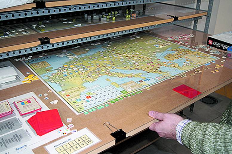 El club también alquila taquillas para que cada socio guarde sus cajas, y aunque Tomás renuncia a cuantificar el número de juegos que aloja el club, sí nos enseña su propio casillero, donde aparece un variado surtido que va desde la Guerra Fría hasta el Barón Rojo, pasando por la Guerra de los 30 años, la rebelión jacobita o la Guerra Civil inglesa. Entre sus favoritos está el “Here I Stand”, sobre las luchas políticas y de religión durante el reinado de Carlos V, con la aparición estelar de Lutero.